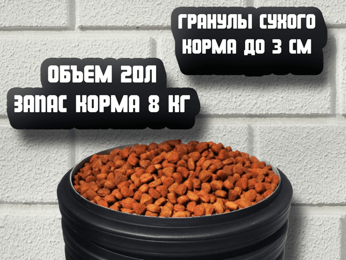 Уличная автоматическая кормушка для собак с дистанционным управлением Характеристики: Объём: 20 л Обогрев механики Запас корма: 8 кг (двухнедельная норма для алабая) Корпус: изготовлен из кольцевой трубы с коэффициентом жёсткости SN8 = 8 кН/м² 🔺Высокая прочность и устойчивость к деформации 🔺Легкий 🔺Электрический ток не пропускает 🔺Не подвержен коррозии 🔺Не выгорает 🔺Не гнется 🔺Не мнется Механизм: Всё механические части изготовлены из металла. - Управление: Настройка по таймеру (удобное кормление по расписанию) - Назначение: для уличных собак в т.ч крупных пород Преимущества: ✔ Работает при температуре до -40"С ✔ Прочный и долговечный корпус, устойчивый к механическим повреждениям ✔ Большой запас корма – снижает частоту дозаправки ✔ Удобное дистанционное управление – контроль кормления на расстоянии ✔ Заводское качество сборки – все комплектующие изготовлены на высокотехнологичном оборудовании ✔ Гранулы корма размером до 3 см ✔ Надёжная, качественная Упаковка Идеально подходит для: Частных домов и вольерного содержания собак Питомников и приютов для животных Автоматизации кормления при отсутствии хозяев Надёжная и функциональная кормушка, обеспечивающая комфортное питание вашего питомца в любых условиях Расписание питания, количество выдаваемого корма настраивается через таймер . Подключается к напряжению 220 вольт. При отключении/подключении электричества устройство восстанавливает свою работу. Все настройки сохраняются на устройстве ( встроена батарейка). ‼️ВНИМАНИЕ ‼️ Таймер устанавливается только в теплом помещении . От таймера проводится кабель(удлинитель) до кормушки. При минусовой температуре ЖК таймера замерзнет -работать не будет. Комплектация : Хомут для навесного крепления (входит в поставку). Инструкция по подключению Дополнительно потребуются угловые кронштейны (покупаются отдельно) или другие совместимые элементы крепления. Рекомендации по выбору кронштейнов указаны в инструкции
