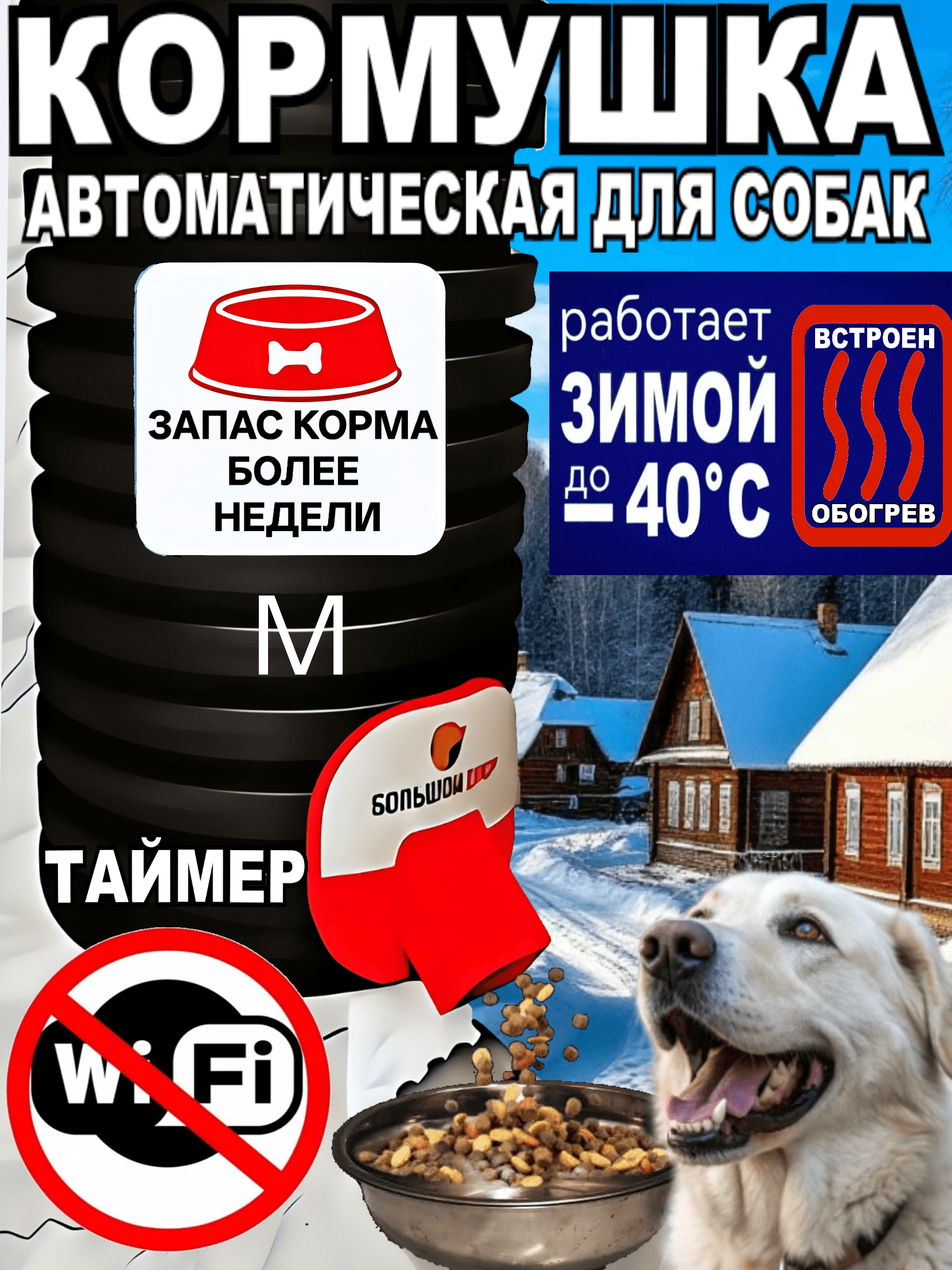 Уличная автоматическая кормушка для собак управление через таймер, с обогревом Характеристики: - Объём: 10л или 4кг сухого корма. Это недельный запас корма для взрослого Алабая, запас корма индивидуален в зависимости от породы, возраста и размера порции вашей собаки - Оснащена обогревом механики - Корпус: изготовлен из кольцевой трубы с коэффициентом жёсткости SN8 = 8 кН/м² Высокая прочность и устойчивость к деформации Легкий Электрический ток не пропускает Не подвержен коррозии Не выгорает, не гнется, не мнется - Механизм оснащен принудительной системой обогрева - Всё механические части изготовлены из металла - Управление: дистанционное через таймер, удобное кормление по расписанию Преимущества: - Работает при температуре до -40"С - Прочный и долговечный корпус, устойчивый к механическим повреждениям - Большой запас корма – снижает частоту дозаправки - Заводское качество сборки – все комплектующие изготовлены на высокотехнологичном оборудовании - Гранулы корма размером до 3 см - Надёжная, качественная упаковка Расписание питания, количество выдаваемого корма настраивается через таймер Подключается к напряжению 220 вольт. При отключении/подключении электричества устройство восстанавливает свою работу. Подключается к напряжению 220 вольт. При отключении/подключении электричества устройство восстанавливает свою работу. Все настройки сохраняются на устройстве (встроена батарейка) ВНИМАНИЕ Таймер устанавливается только в теплом помещении . От таймера проводится кабель (удлинитель) до кормушки. При минусовой температуре ЖК таймера замерзнет и работать не будет В комплект входит хомут для навесного крепления, инструкция по подключению *Дополнительно потребуются угловые кронштейны (покупаются отдельно) или другие совместимые элементы крепления **Рекомендации по выбору кронштейнов указаны в инструкции. Приобрести их можно в любом строительном магазине