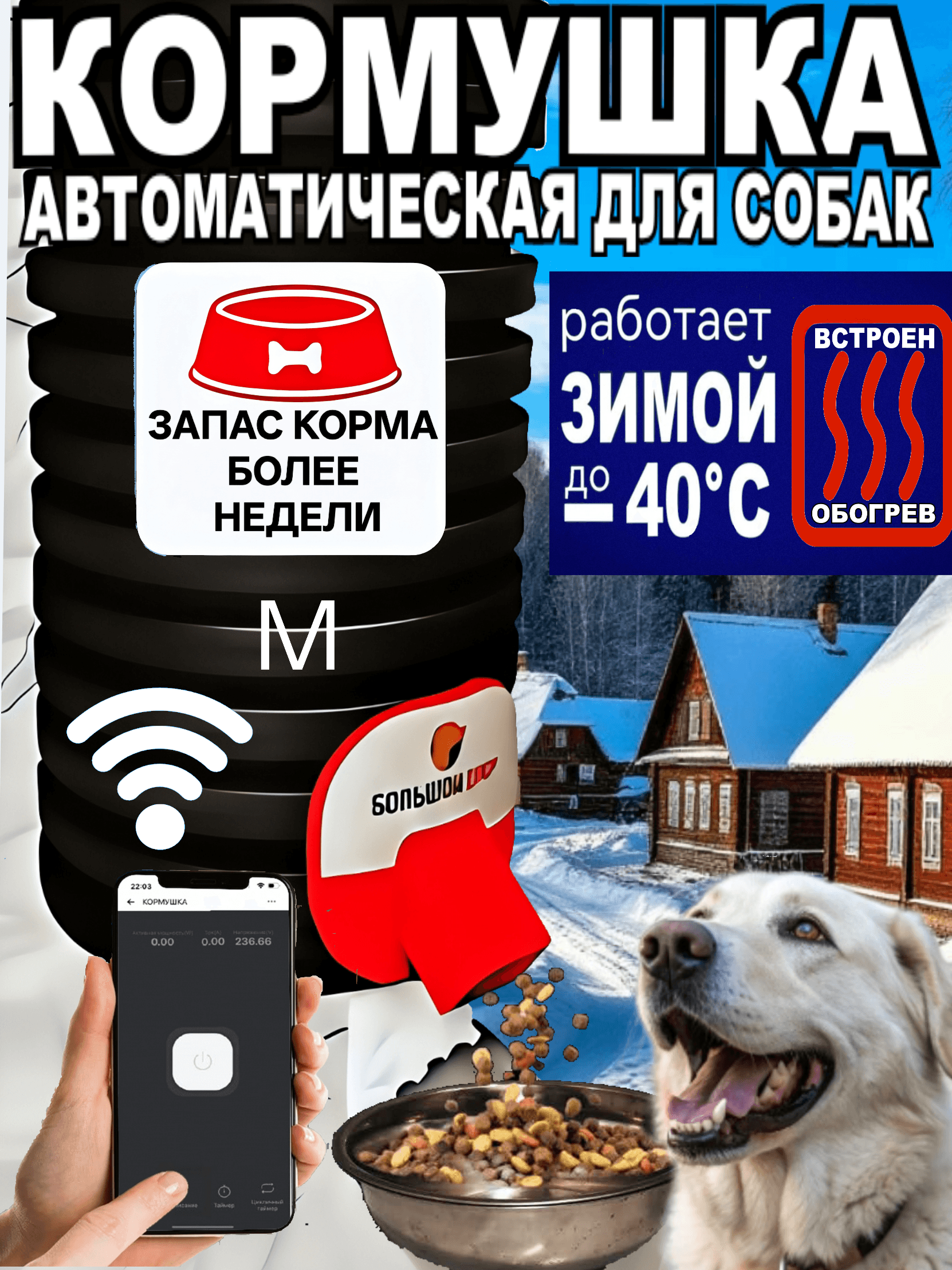 Уличная автоматическая кормушка для собак с дистанционным управлением через телефон с обогревом Характеристики: - Объём: 10л или 4кг сухого корма. Это недельный запас корма для взрослого Алабая, запас корма индивидуален в зависимости от породы, возраста и размера порции вашей собаки - Оснащена обогревом механики - Корпус: изготовлен из кольцевой трубы с коэффициентом жёсткости SN8 = 8 кН/м² Высокая прочность и устойчивость к деформации Легкий Электрический ток не пропускает Не подвержен коррозии Не выгорает, не гнется, не мнется - Механизм оснащен принудительной системой обогрева - Всё механические части изготовлены из металла - Управление: дистанционное со смартфона через приложение, удобное кормление по расписанию Преимущества: - Работает при температуре до -40"С - Прочный и долговечный корпус, устойчивый к механическим повреждениям - Большой запас корма – снижает частоту дозаправки - Удобное дистанционное управление – контроль кормления на расстоянии - Заводское качество сборки – все комплектующие изготовлены на высокотехнологичном оборудовании - Гранулы корма размером до 3 см - Надёжная, качественная упаковка Расписание питания, количество выдаваемого корма настраивается через приложение по Wi-Fi. Все настройки сохраняются на устройстве. Отключение Wi-Fi не влияет работу устройства, оно продолжает работать как реле времени. Подключается к напряжению 220 вольт. При отключении/подключении электричества устройство восстанавливает свою работу и подключение к сети Wi-Fi. Удаленно через приложение можно внести корректировки в расписание и объем выдаваемого корма Приложение при помощи Push уведомлений сообщает о включении и выключении устройства и о пропаже В комплект входит хомут для навесного крепления, инструкция по подключению *Дополнительно потребуются угловые кронштейны (покупаются отдельно) или другие совместимые элементы крепления **Рекомендации по выбору кронштейнов указаны в инструкции. Приобрести их можно в любом строительном магазине