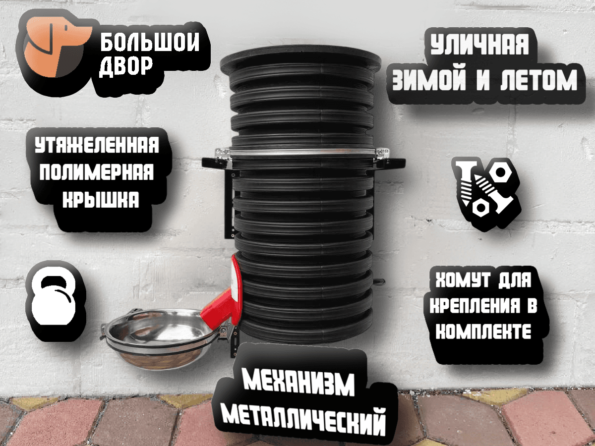 Уличная автоматическая кормушка для собак с дистанционным управлением Характеристики: Объём: 20 л Оснащена обогревом механики Запас корма: 8 кг (двухнедельная норма для алабая) Корпус: изготовлен из кольцевой трубы с коэффициентом жёсткости SN8 = 8 кН/м² 🔺Высокая прочность и устойчивость к деформации 🔺Легкий 🔺Электрический ток не пропускает 🔺Не подвержен коррозии 🔺Не выгорает 🔺Не гнется 🔺Не мнется Механизм: Всё механические части изготовлены из металла. - Управление: дистанционное со смартфона через приложение (удобное кормление по расписанию) - Назначение: для уличных собак в т.ч крупных пород Преимущества: ✔ Работает при температуре до -40"С ✔ Прочный и долговечный корпус, устойчивый к механическим повреждениям ✔ Большой запас корма – снижает частоту дозаправки ✔ Удобное дистанционное управление – контроль кормления на расстоянии ✔ Заводское качество сборки – все комплектующие изготовлены на высокотехнологичном оборудовании ✔ Гранулы корма размером до 3 см ✔ Надёжная, качественная Упаковка Идеально подходит для: Частных домов и вольерного содержания собак Питомников и приютов для животных Автоматизации кормления при отсутствии хозяев Надёжная и функциональная кормушка, обеспечивающая комфортное питание вашего питомца в любых условиях Расписание питания, количество выдаваемого корма настраивается через приложение по Wi-Fi. Все настройки сохраняются на устройстве. Отключение Wi-Fi не влияет работу устройства оно продолжает работать как реле времени. Подключается к напряжению 220 вольт. При отключении/подключении электричества устройство восстанавливает свою работу и подключение к сети Wi-Fi. Удаленно через приложение можно внести корректировки в расписание и объем выдаваемого корма. Приложение при помощи Push уведомлений сообщает о включении и выключении устройства и о пропаже электричества. Комплектация : Хомут для навесного крепления (входит в поставку). Инструкция по подключению **Дополнительно потребуется:*- Угловые кронштейны